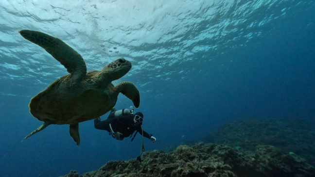 アオウミガメとは待ち合わせしていたかのように会え、一緒に泳ぐこともできました!